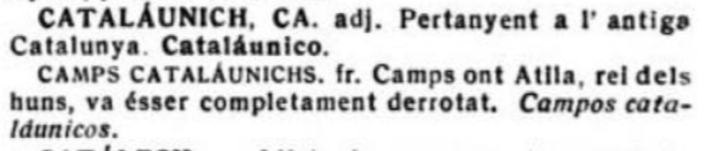 D'aquesta manera, el diccionari relaciona amb tota nauralitat el terme catalàunich, que defineix als antics catalans, amb els camps catalàunichs, habitats pel poble dels gals catalauni, de la Belgica Secunda.